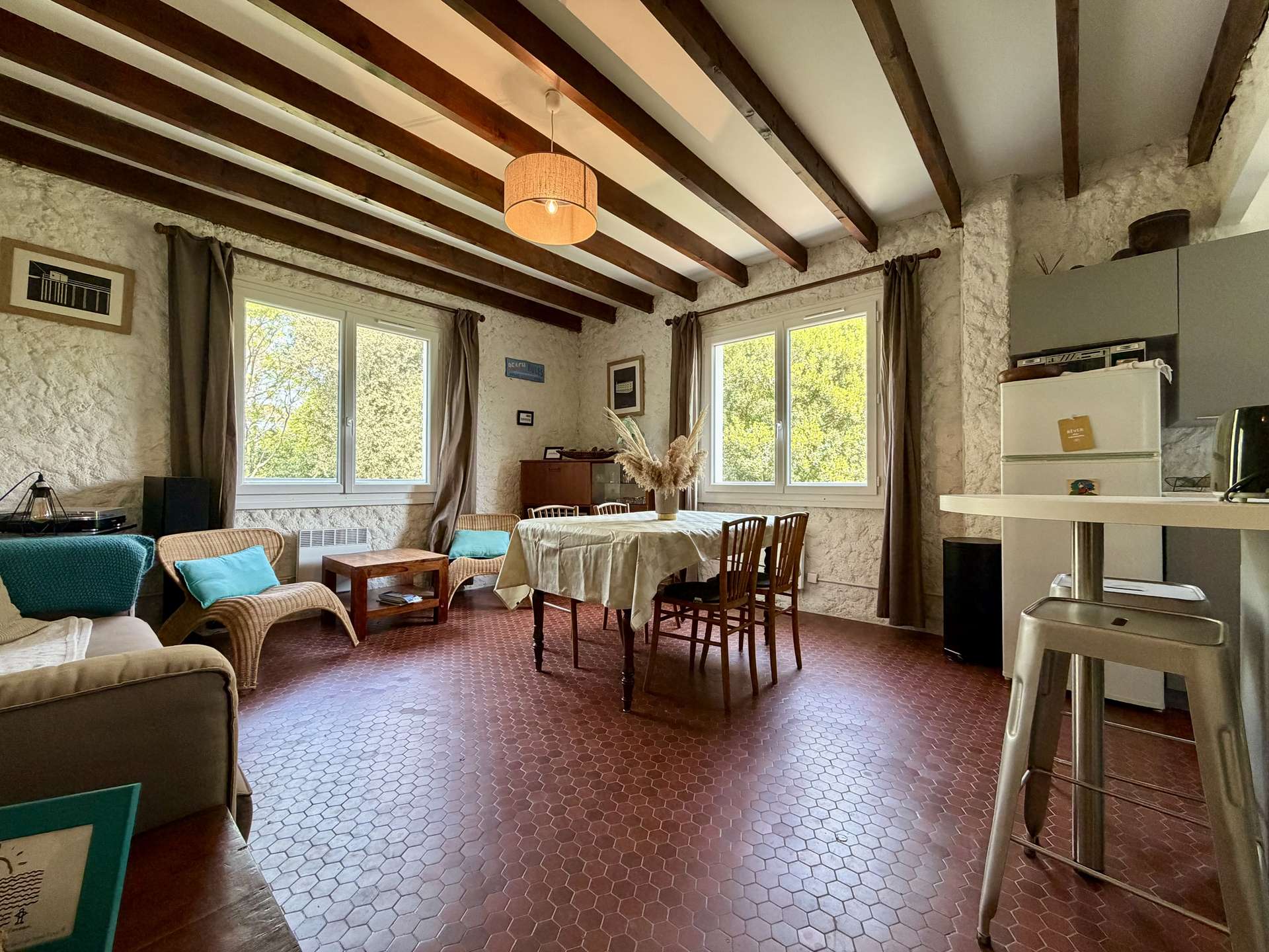 La pièce de vie comprend un salon / séjour convivial et une cuisine ouverte entièrement équipée, parfaite pour partager de bons moments après une journée de découverte.