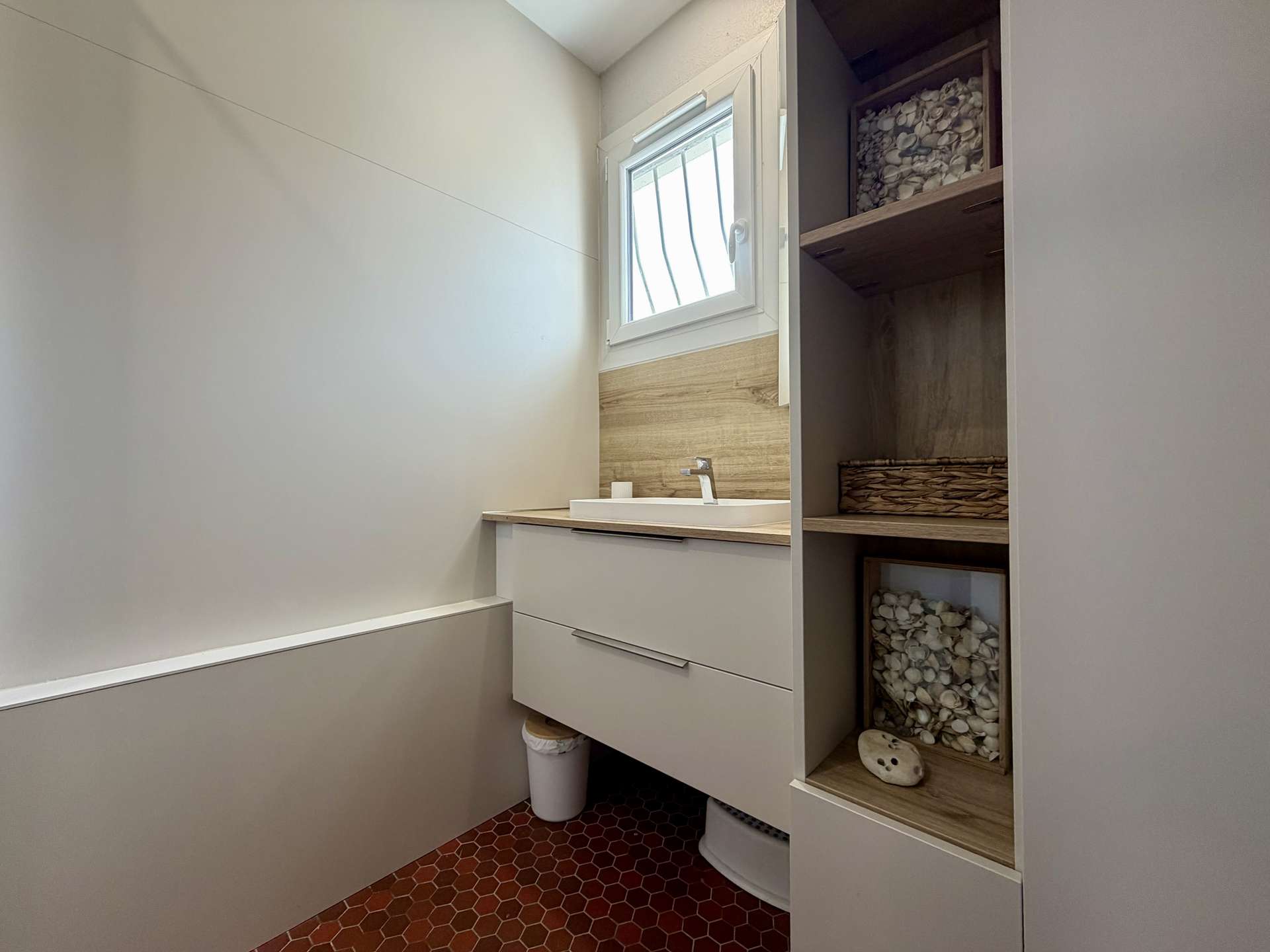 Une salle d’eau moderne avec douche et meuble vasque complète ce bien.