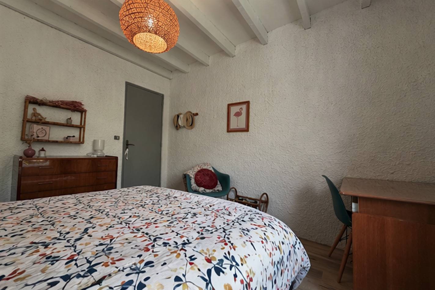 Une chambre avec un lit double (160 cm), un bureau et des rangements.