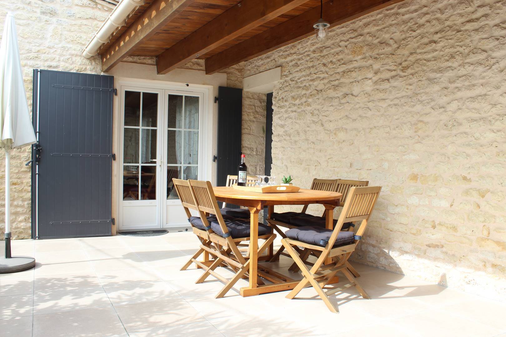 A l'extérieur, une terrasse semi-couverte avec salon de jardin et barbecue. Stationnement dans la ruelle.