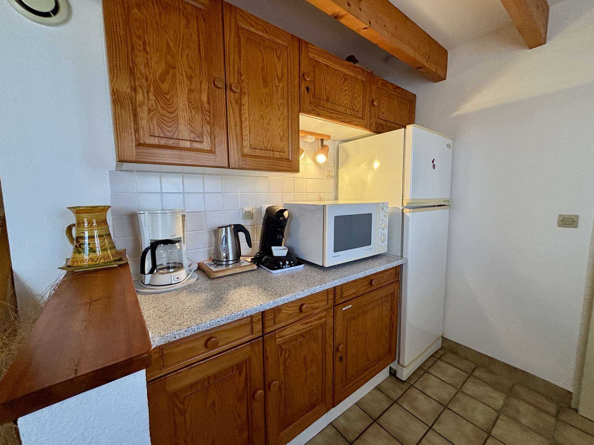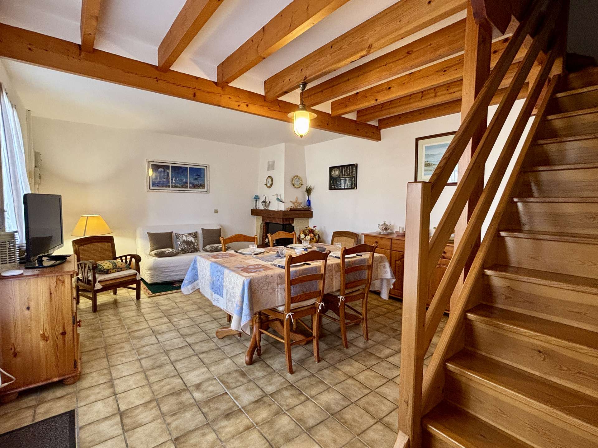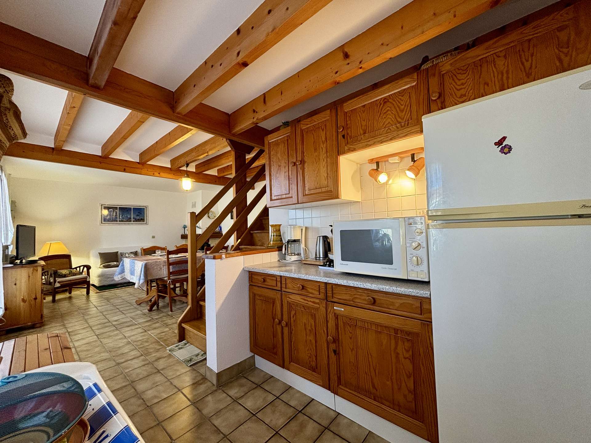 La maison offre une pièce de vie lumineuse avec coin cuisine (réfrigérateur, micro-ondes, cafetière Senseo), un espace salon, ainsi qu’une arrière-cuisine entièrement équipée (gazinière, lave-vaisselle, lave-linge, robot multifonction, air fryer). Une salle de bain et un WC indépendant complète le rez-de-chaussée.