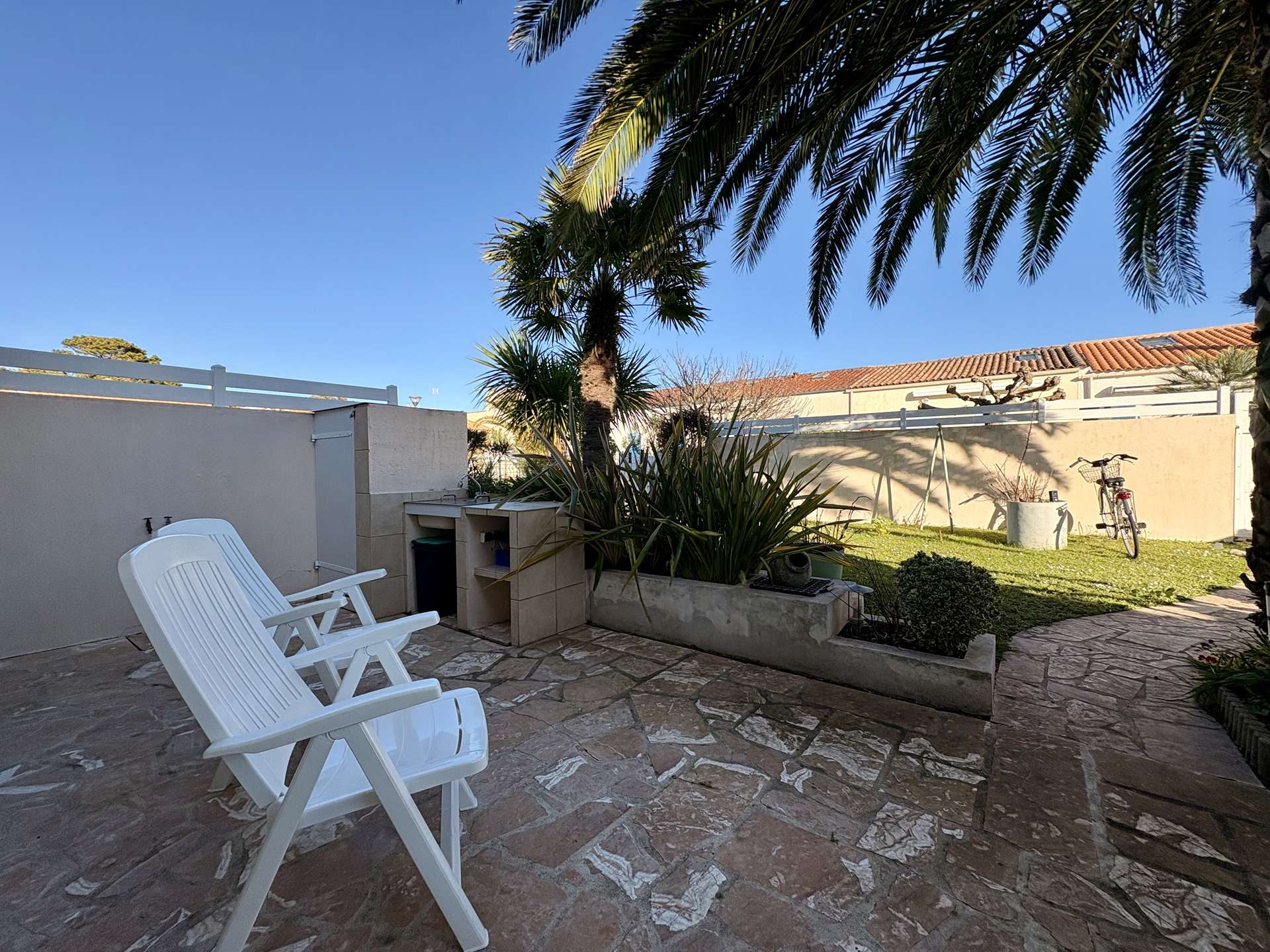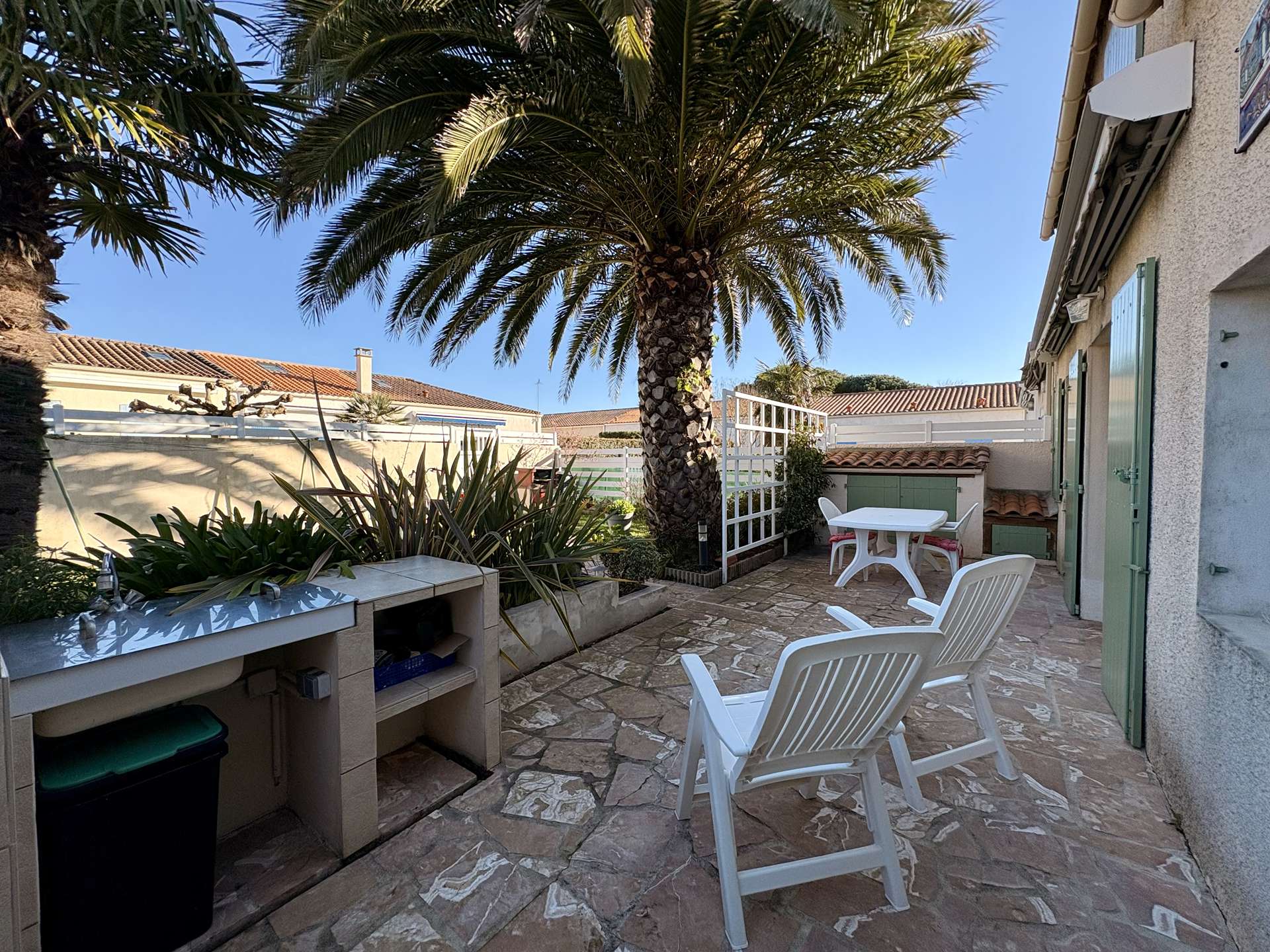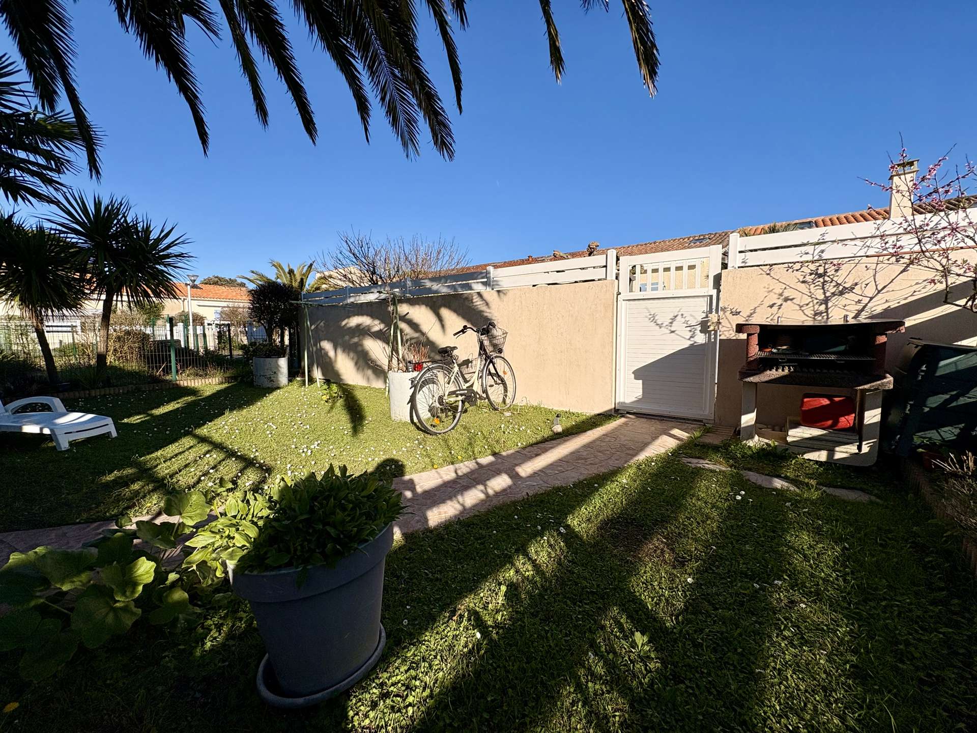 À l’extérieur, profitez d’un jardin clos avec un grand palmier, d’une terrasse carrelée parfaite pour les repas en plein air, ainsi que de mobilier de jardin et transats pour vos moments de détente.
