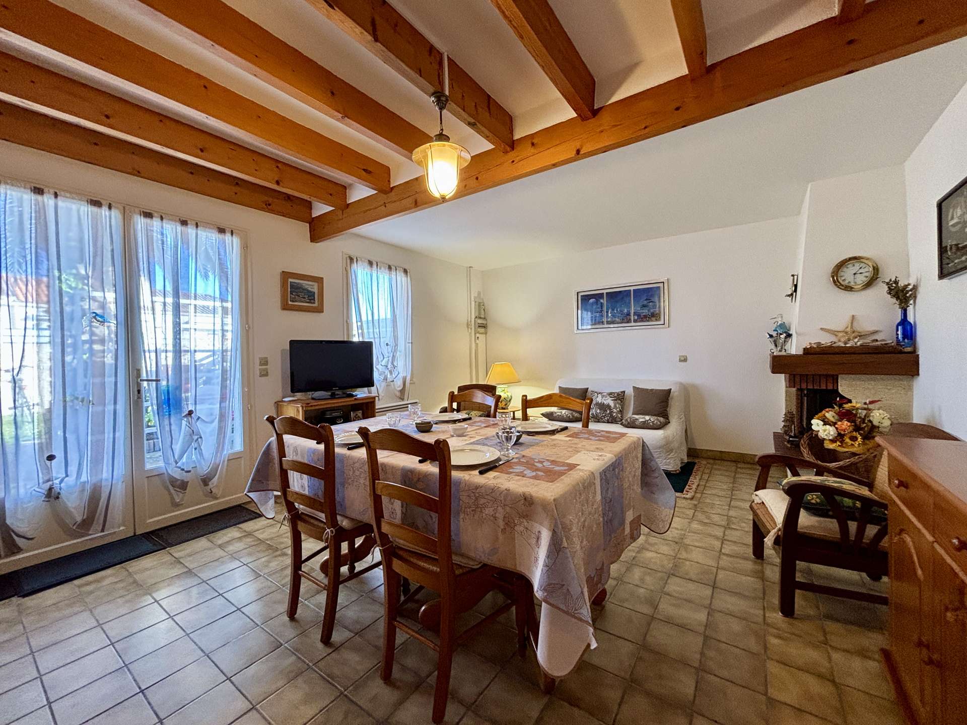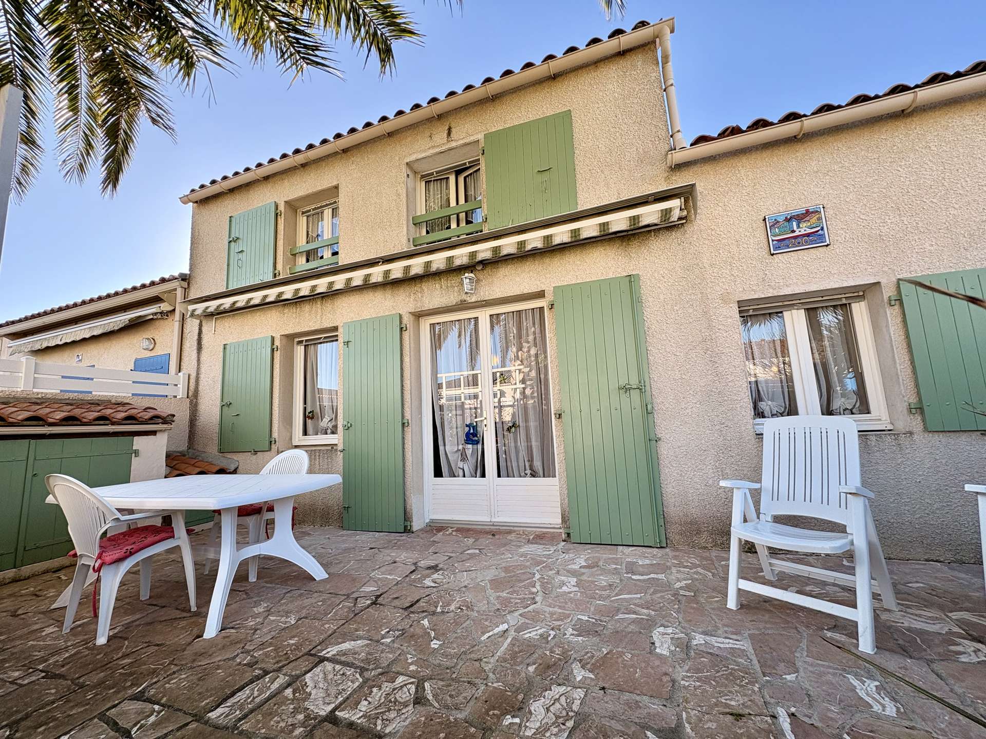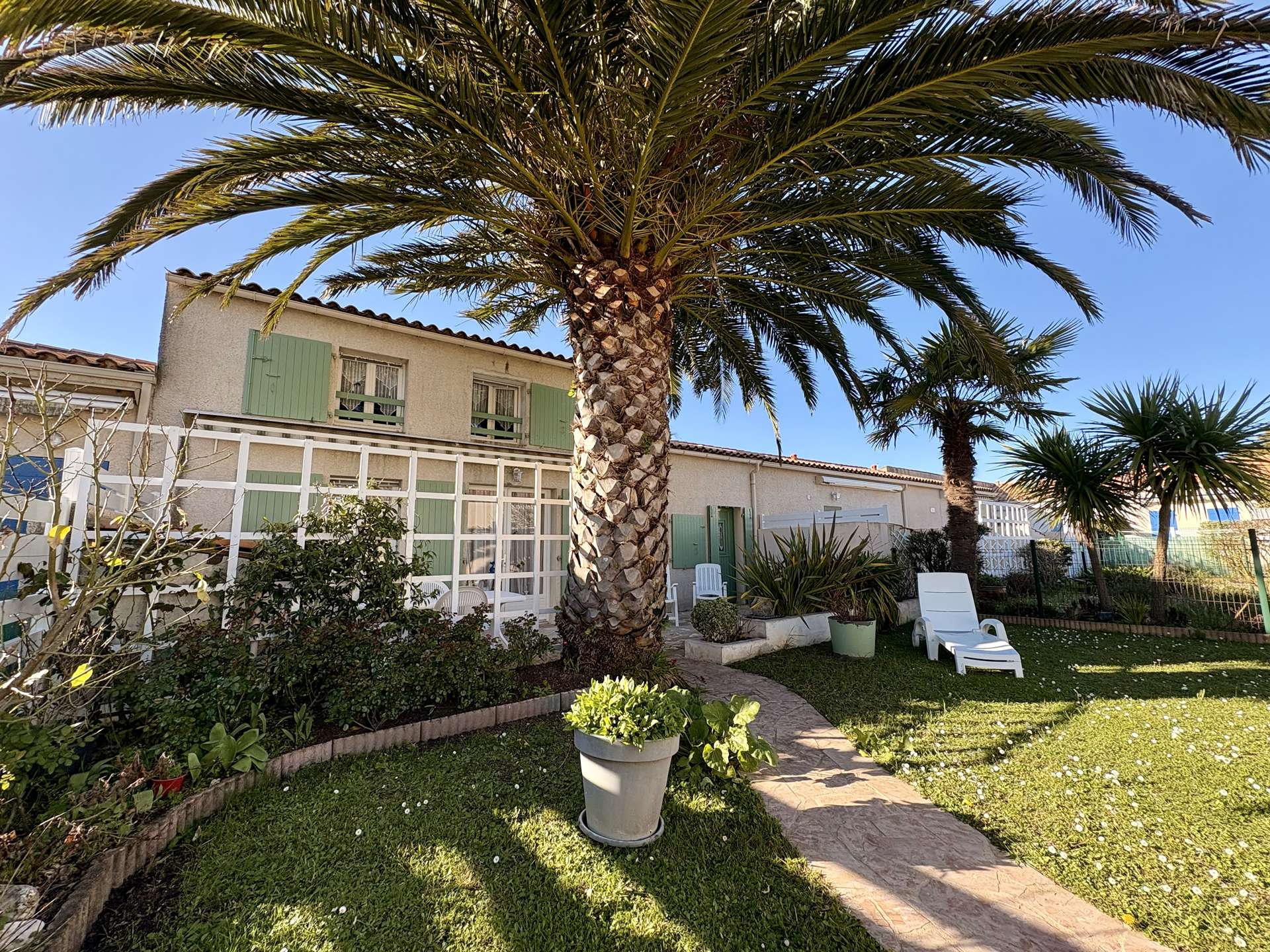 À l’extérieur, profitez d’un jardin clos avec un grand palmier, d’une terrasse carrelée parfaite pour les repas en plein air, ainsi que de mobilier de jardin et transats pour vos moments de détente.