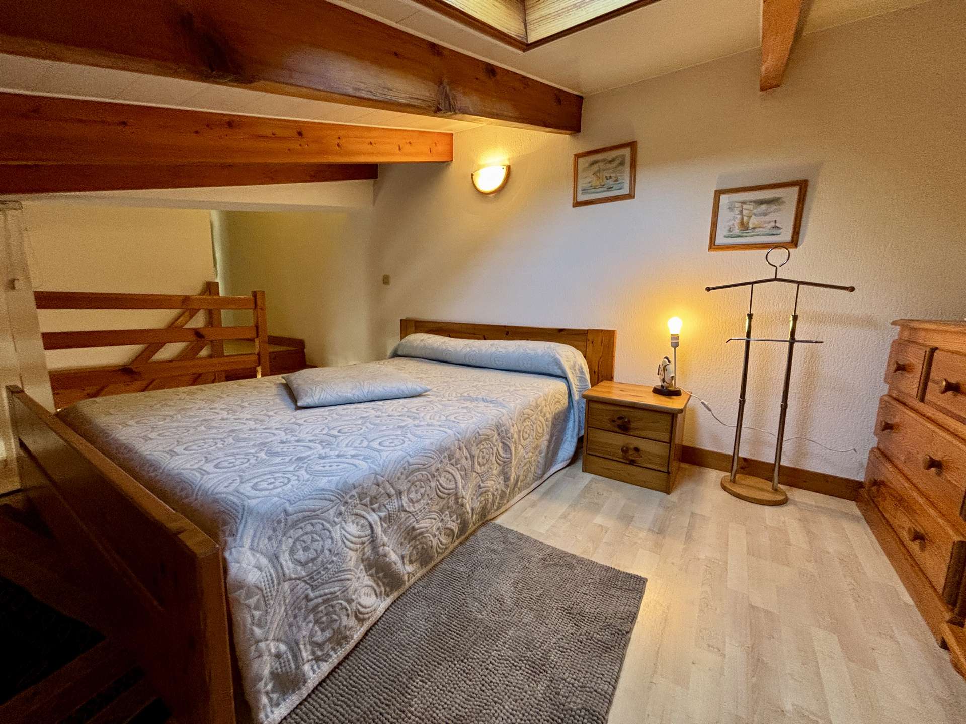 Une mezzanine avec un lit double (140) et un lit simple (80) et deux chambres, chacune équipée d’un lit double (140)