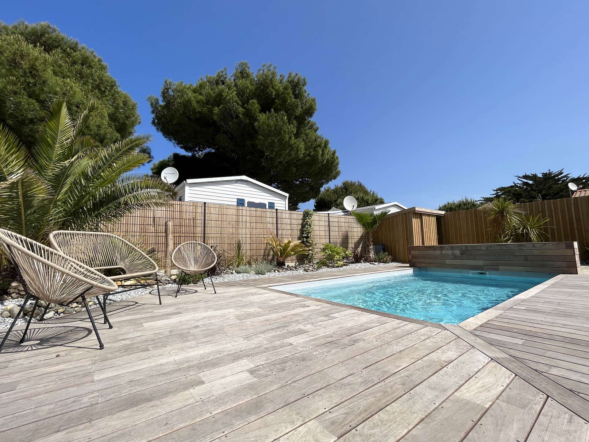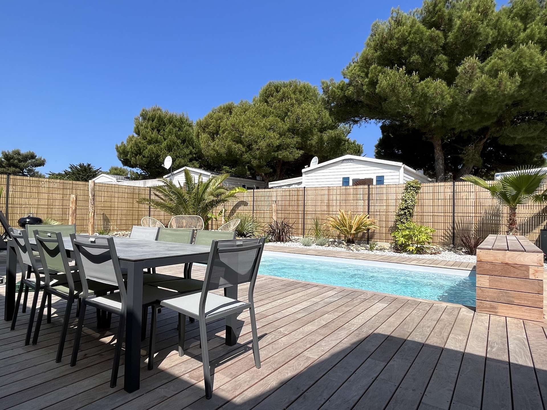 Belle maison contemporaine avec charpente apparente sur un terrain de 500 m² environ avec piscine privée se composant d'une grande pièce de vie avec cuisine ouverte aménagée et équipée, d'une première chambre avec un lit deux couchages (160) et rangements, d'une deuxième chambre avec un lit deux couchages (140), un lit un couchage (90) et rangements, ces deux chambres possèdent une salle d'eau attenante ainsi qu'un WC indépendant, d'une troisième chambre avec un lit deux couchages (160) et rangements, d'un quatrième chambre avec un lit deux couchages (140), un lit un couchage (90) et rangements, ces deux chambres possèdent également une salle d'eau attenante ainsi qu'un WC indépendant, d'un cellier avec rangements. A l'extérieur, une terrasse donnant sur une piscine privée (ouverte et chauffée de mi-juin à mi-septembre) à l'abri des regards ainsi qu'une douche extérieure. Parking sur le terrain.