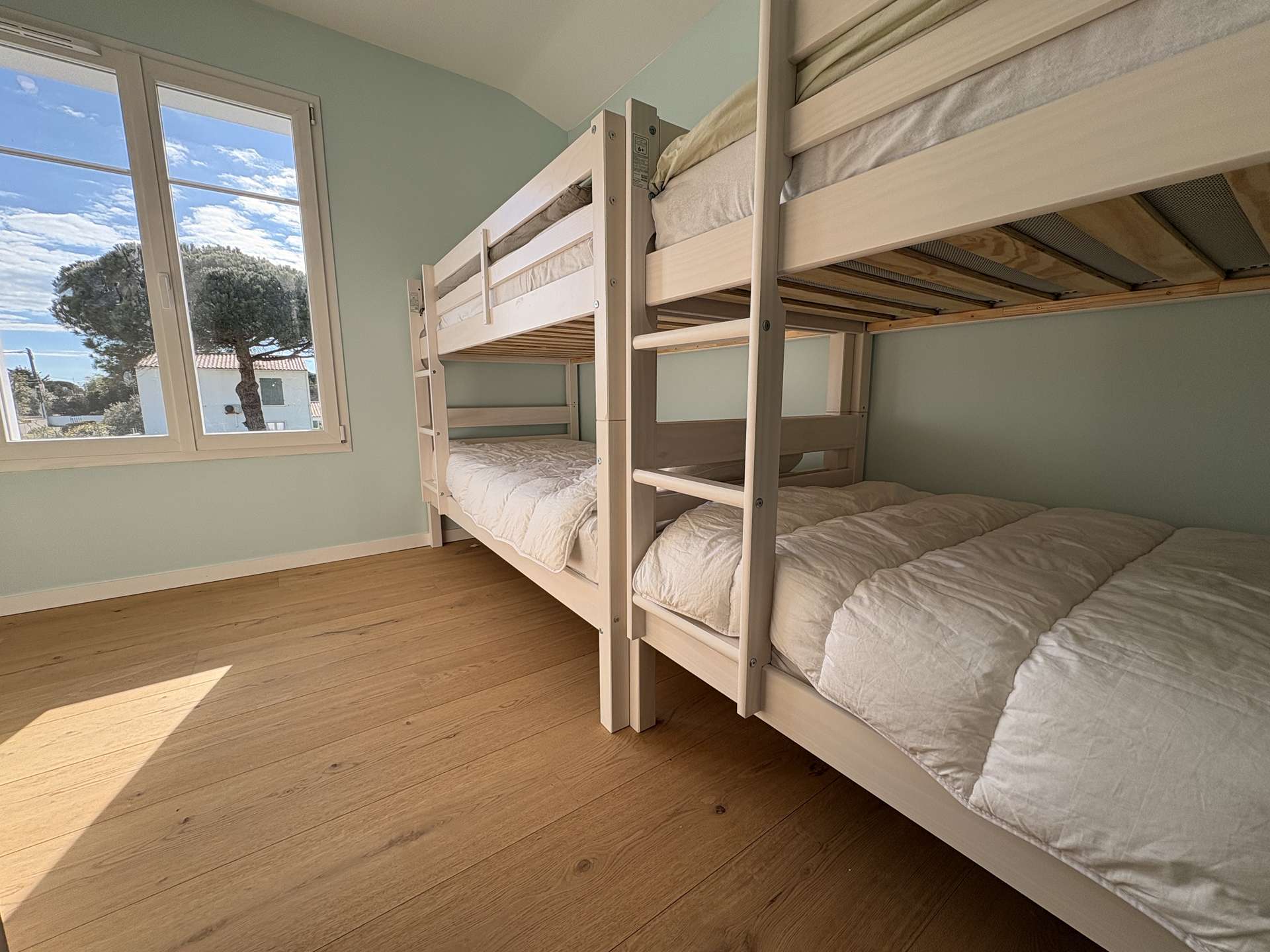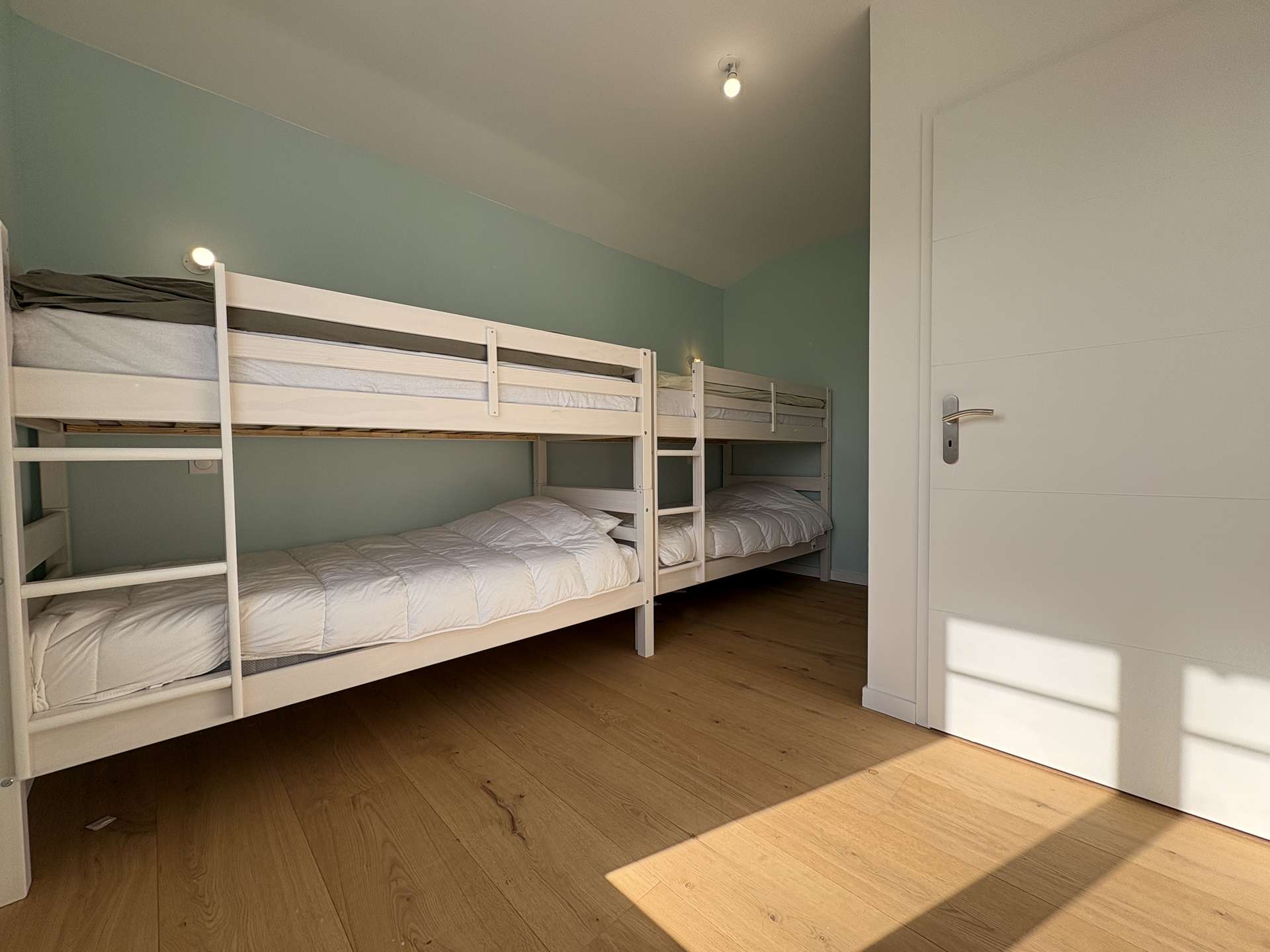 À l’étage, chacun trouvera son espace avec quatre chambres supplémentaires avec literie neuve de qualité premium: deux chambres avec lits doubles 160 cm, une chambre avec deux lits simples 80 cm et une chambre avec deux lits superposés 80 cm, complétées par deux salles d’eau modernes et deux WC indépendants.