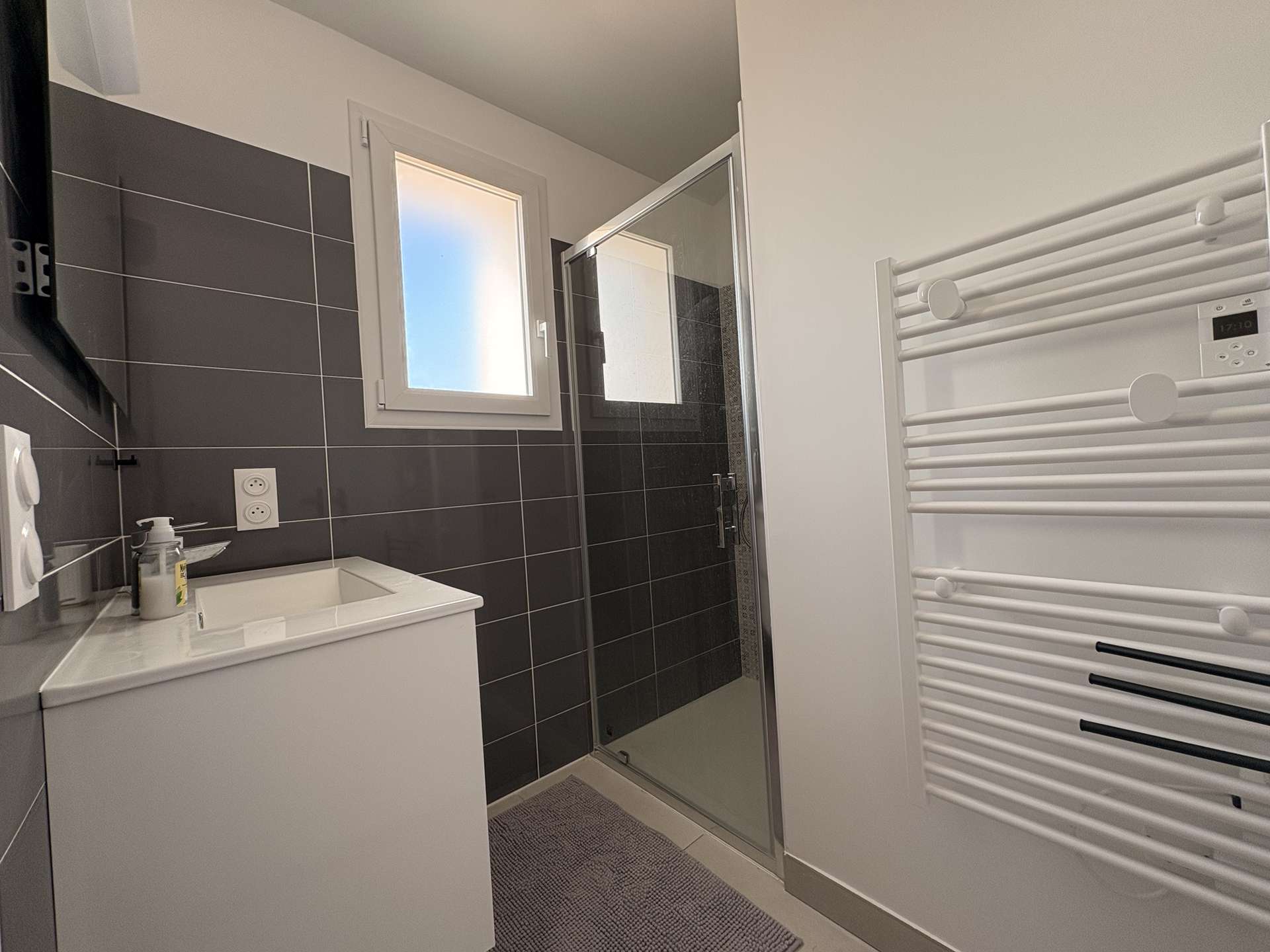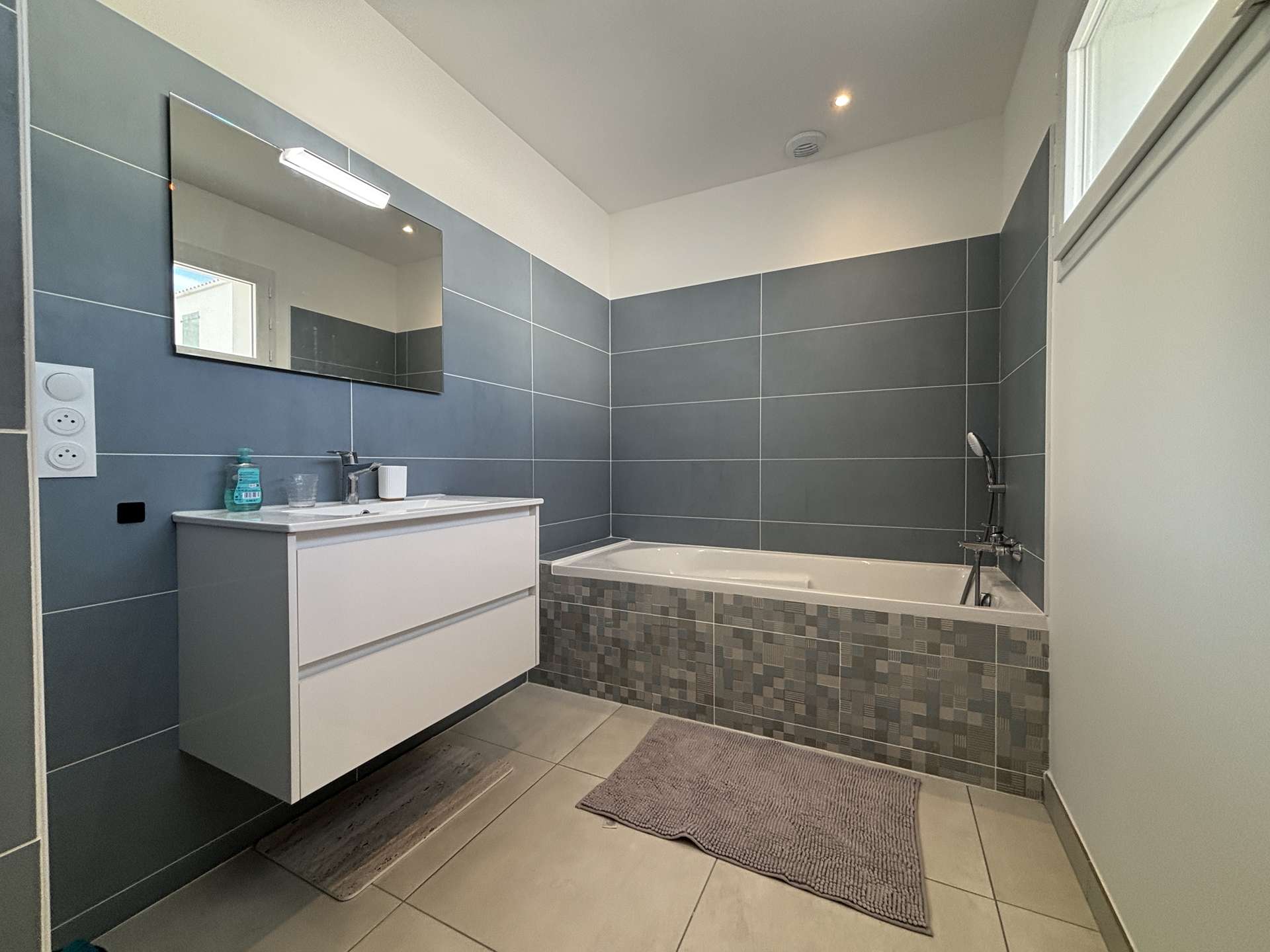 Le rez-de-chaussée accueille également deux belles chambres avec literie neuve de qualité premium : une avec un lit double 180 cm et une seconde avec un lit double 160 cm avec accès direct au jardin et à la piscine, ainsi qu’une salle de bain complète avec baignoire, douche et meuble vasque ainsi qu’un WC indépendant.