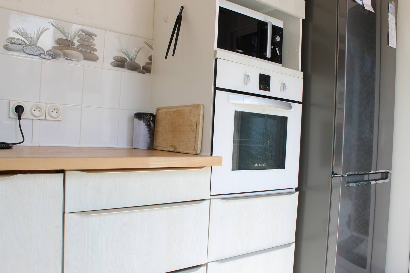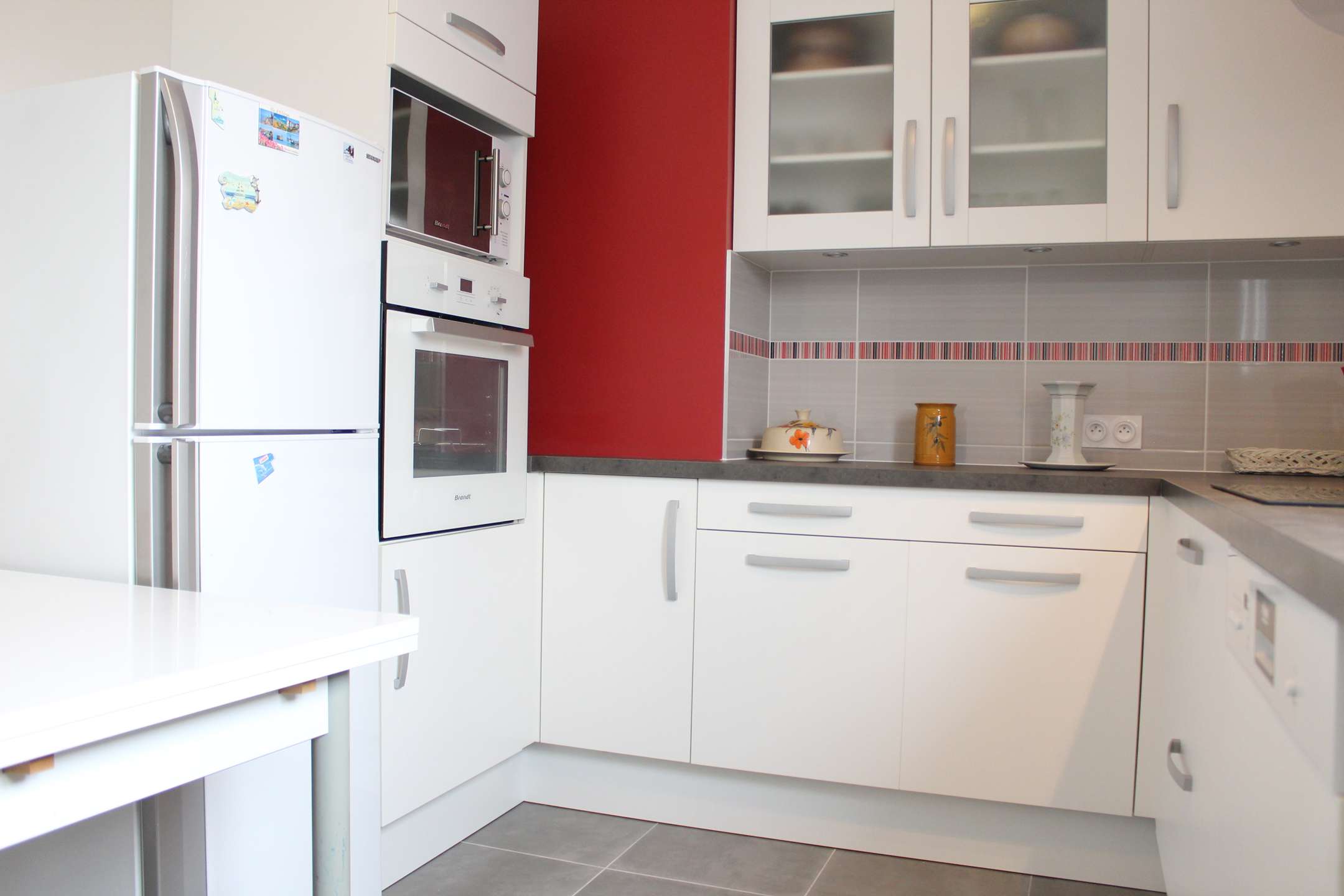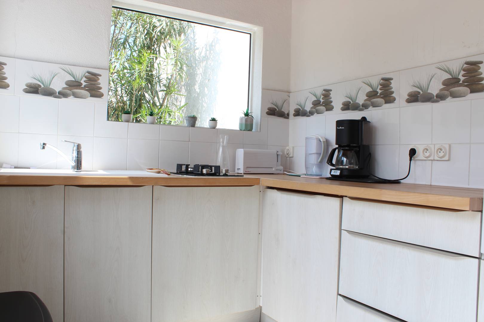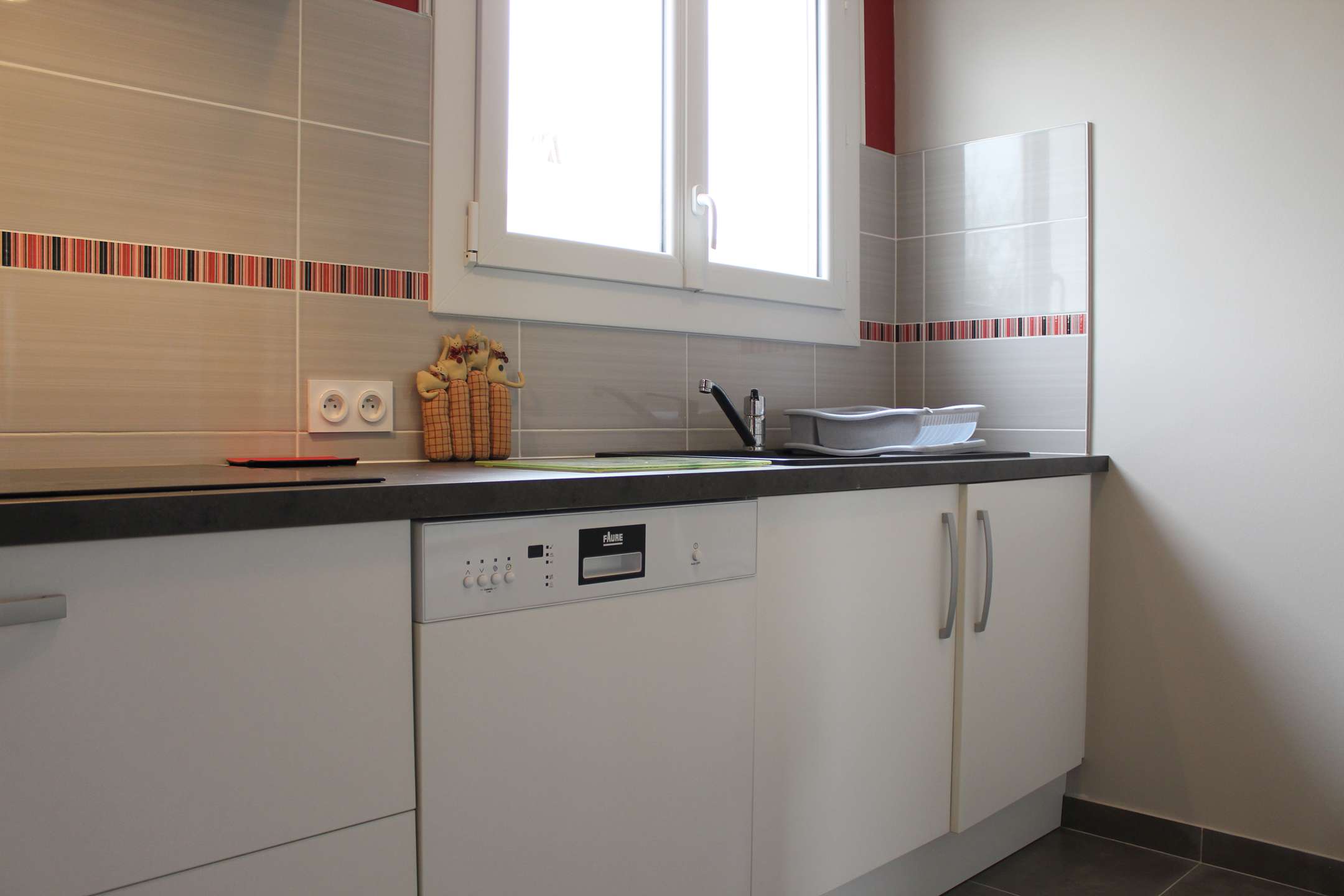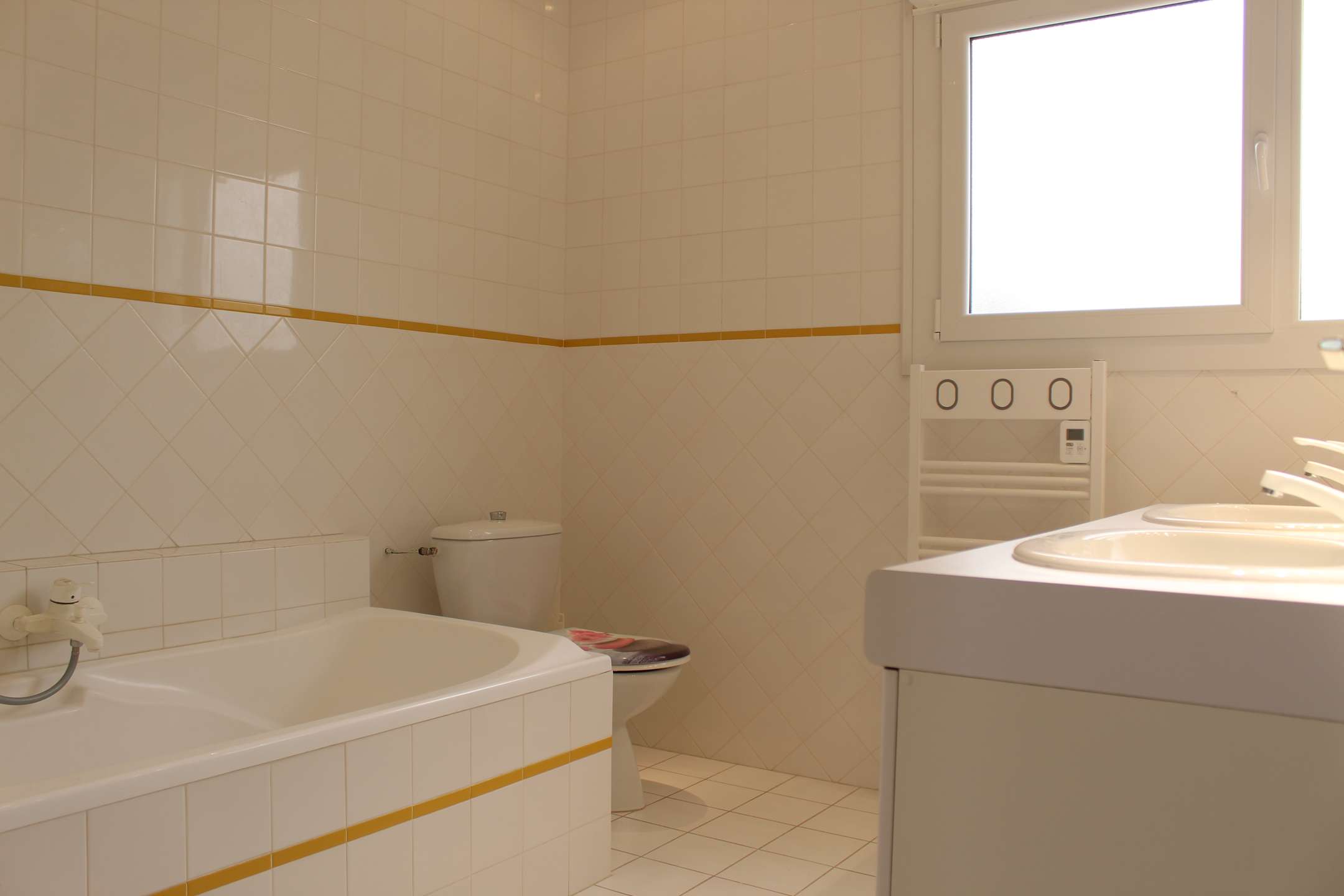 Elle se compose au première étage d'une entrée avec placard, d'une chambre avec lit 140, d'une salle de bain avec WC, une seconde chambre avec deux lits 90 et placard, une troisième chambre avec canapé lit 140 et placard, cuisine équipée (lave-vaisselle, four, micro-ondes, plaques électriques, frigo), pièce de vie avec balcon. Au rez de chaussée, buanderie avec machine à laver, cuisine d'été (lave-vaisselle, plaques 2 feux gaz, four, micro-ondes, frigo avec partie congélateur). En extérieur terrasse et jardin. Parking sur la propriété.