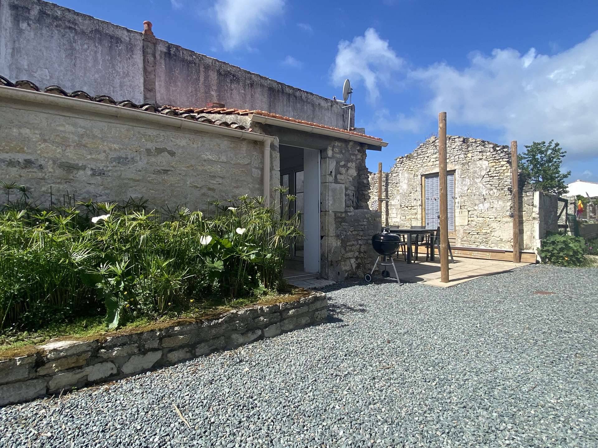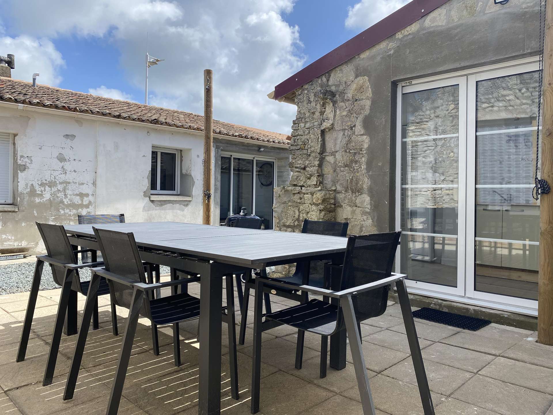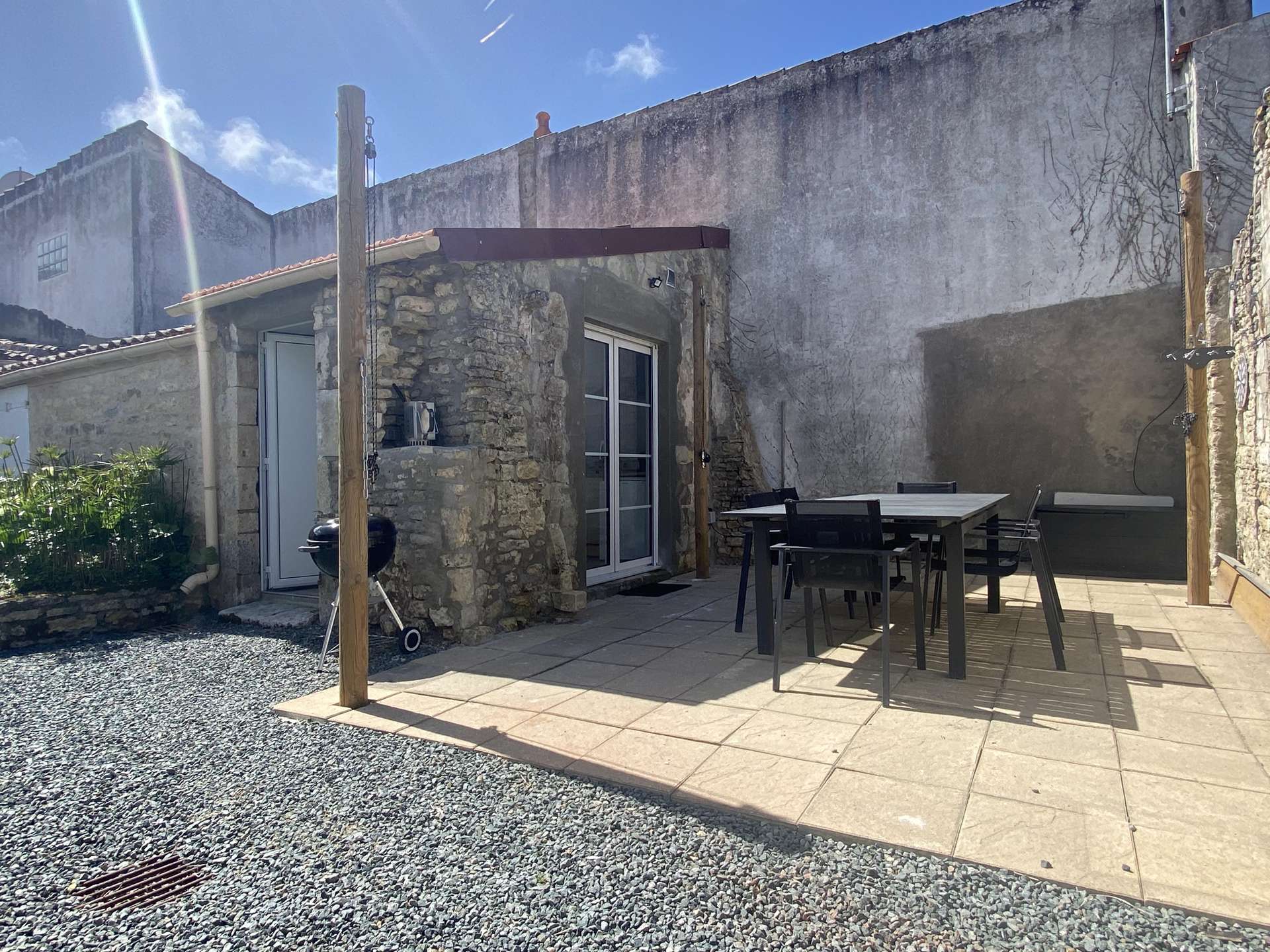 En extérieur, terrasse privative avec mobilier de jardin, barbecue, voile d'ombrage ( Information : servitude de passage entre la maison et la terrasse, très peu empruntée). Cuisine d'été avec plancha, Stationnement public à 100 m de la maison.